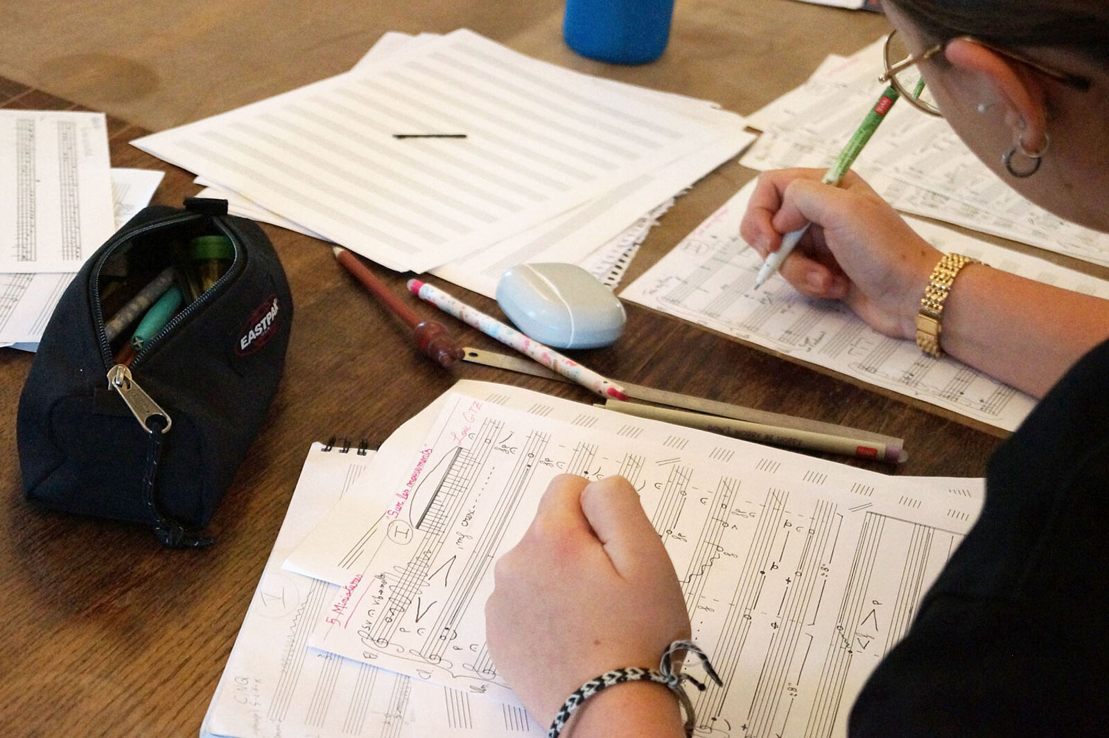 Notenblätter liegen auf einem Tisch – darüber zwei Hände, eine davon hält einen Stift